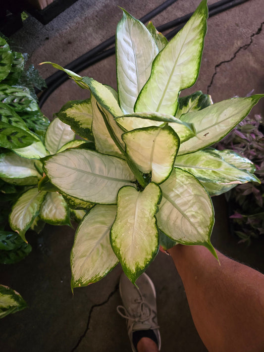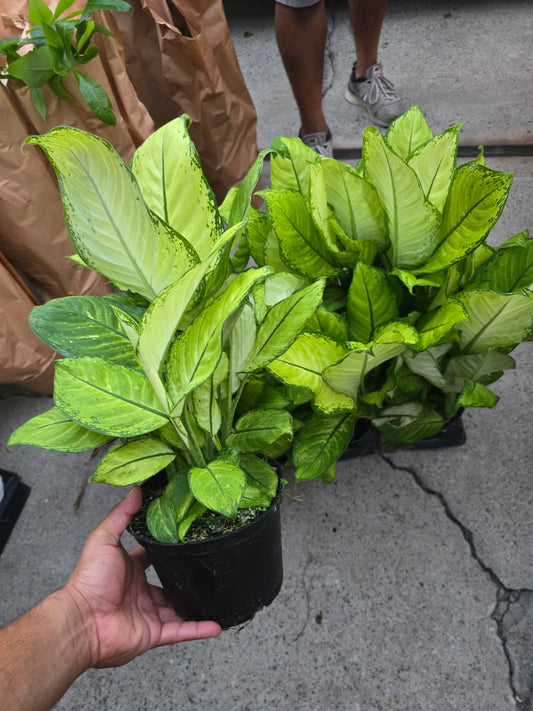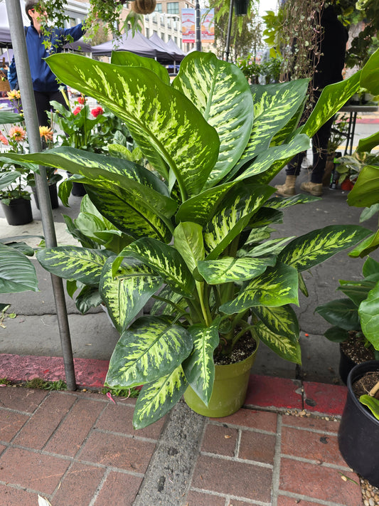 Dieffenbachia, often referred to as "dumb cane," is a popular houseplant known for its large, variegated leaves. The leaves are typically green with white or yellow markings, making them a striking addition to any indoor space.